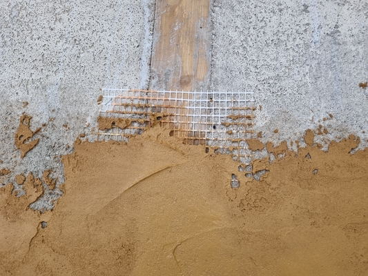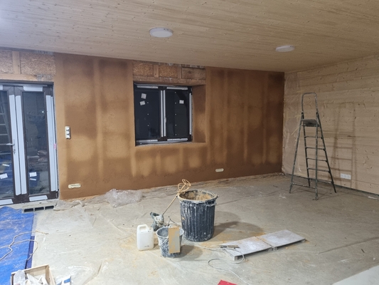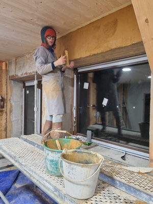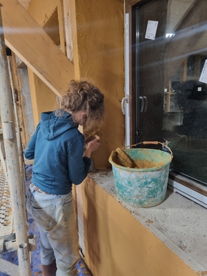 Sur les murs, Charlotte se charge des enduits terre. On trame en fibre de verre au niveau des poteaux boisC'est Charlotte la maitresse de la terreLors du séchage on voit encore les fantômes des montants bois, ça disparaitra après séchage définitif Identifiez-vous pour poster des commentaires