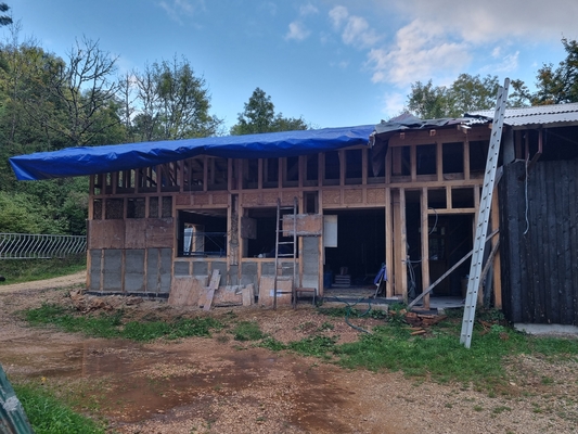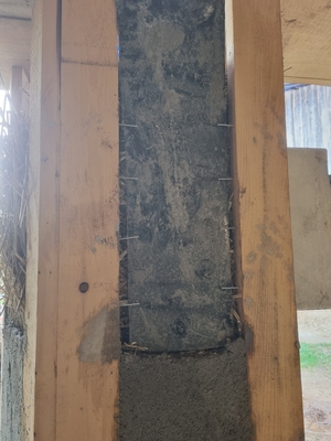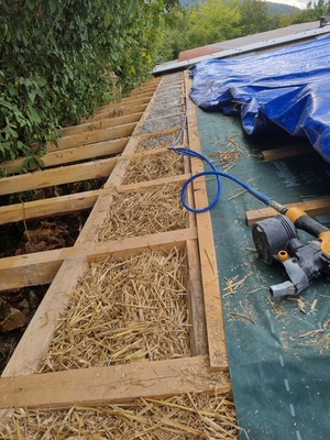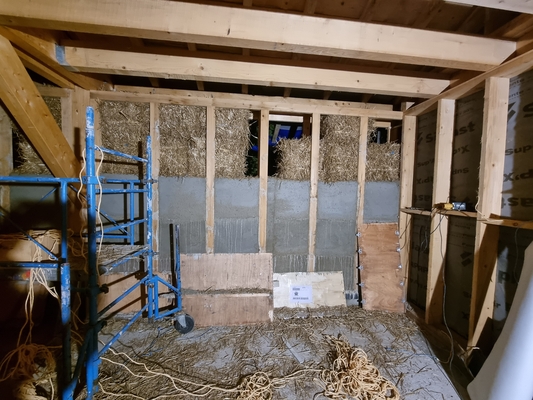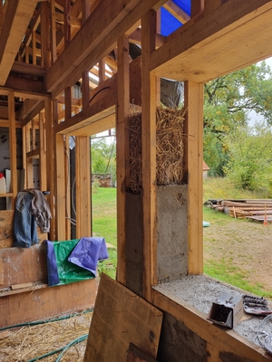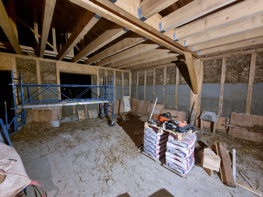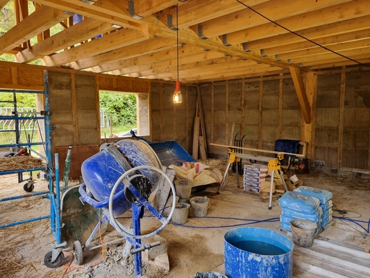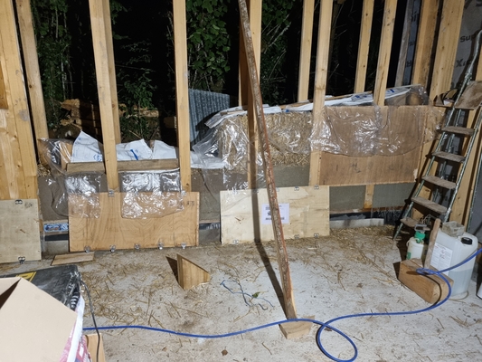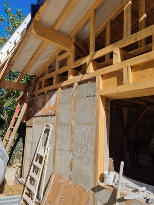 Monter les murs prend particulièrement du temps ! On monte de plus en plus haut le mortier et on a de moins en moins de place pour glisser les bottes... Il faut donc souvent les couper en deux et les reficeler. Et glisser le mortier derrière les banches peut devenir ardu !