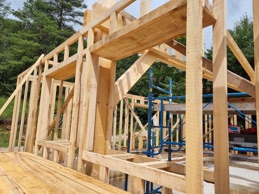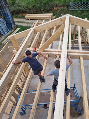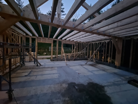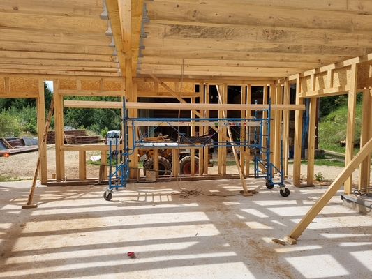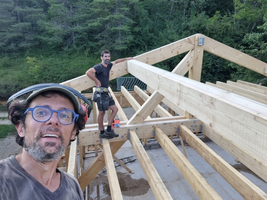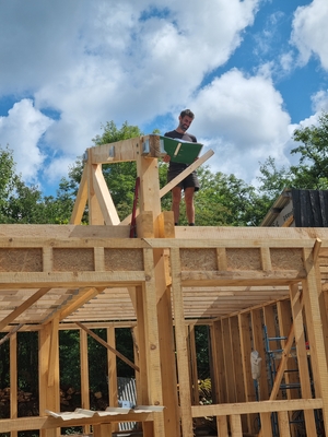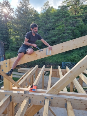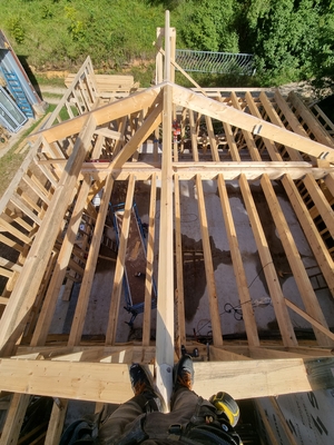 On continue l'élévation des murs en ossature, avec les solives du plafond, les pannes du toit. Linteaux et appuis de fenêtresSolives poséesPréparation de la pose des pannesPremière panne poséeVérification des cotes !Première panne faîtière poséeDeuxième panne faîtière posée !Méthode pour monter une panne de 5,20m de long seul : utiliser l'échafaudage, une corde, etc. Mais c'est mieux à plusieurs ! Identifiez-vous pour poster des commentaires