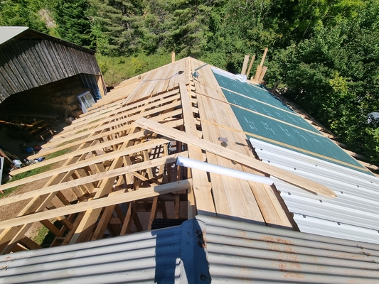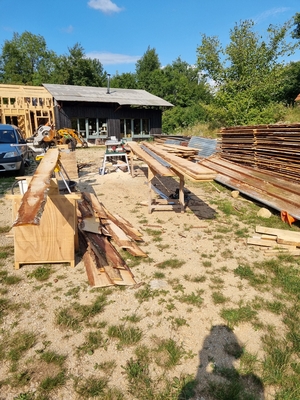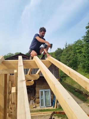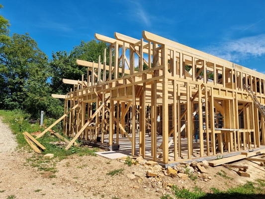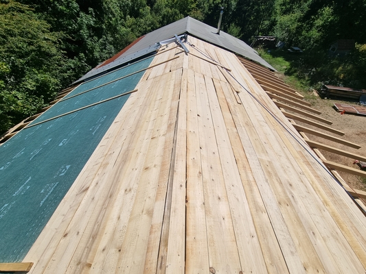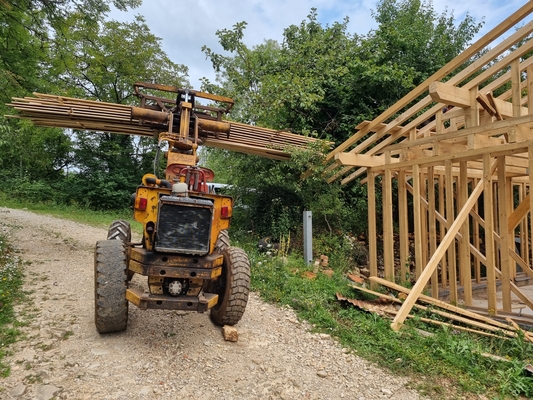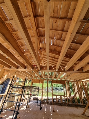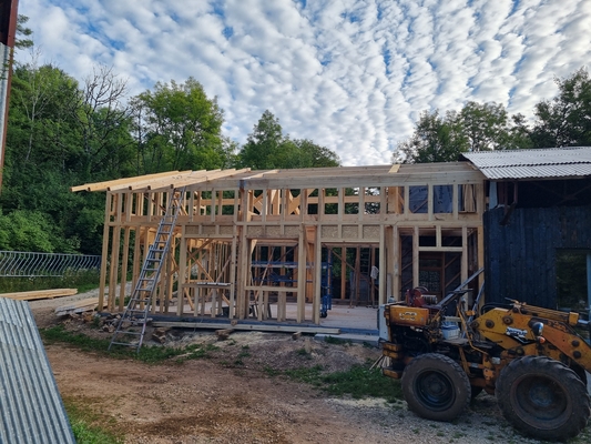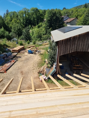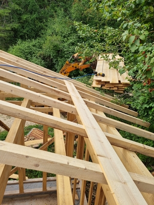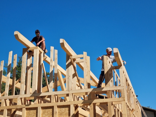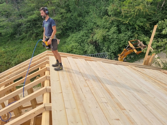 Une fois les pannes posées, on va venir poser les chevrons, puis la volige, puis le pare-pluie, puis des liteaux, etc...